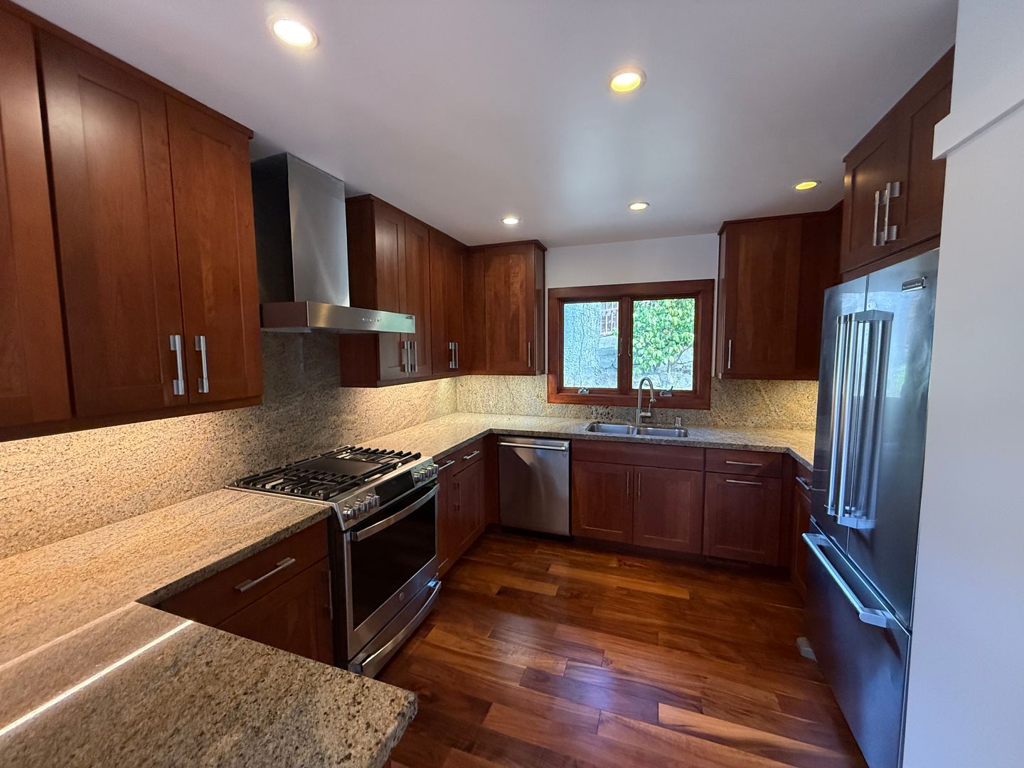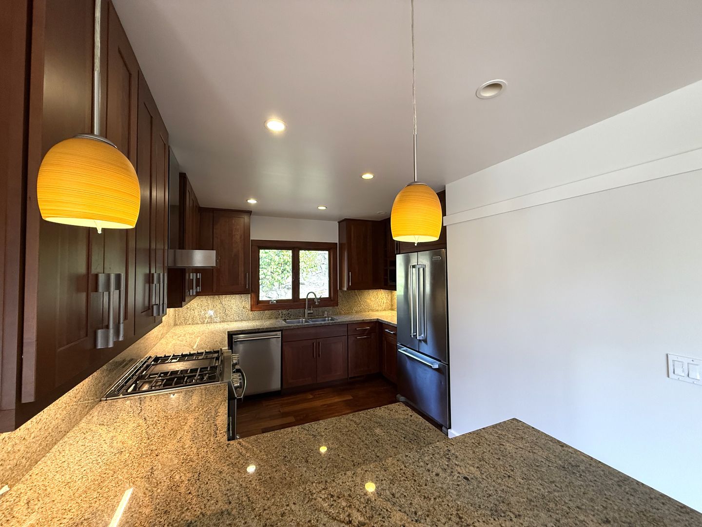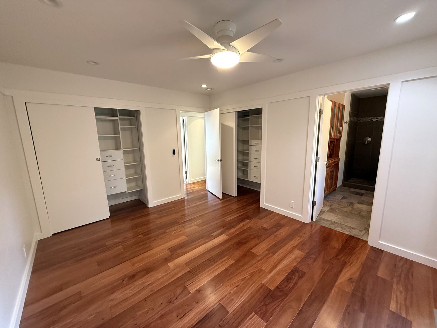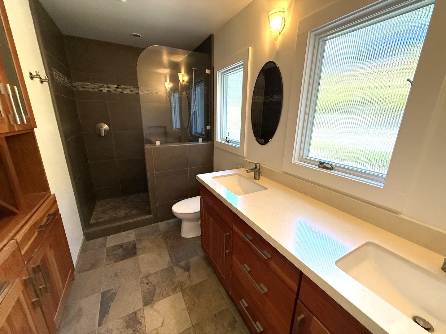 Primary bedroom offers two large closets, a private entrance, and primary bathroom with large expansive walk-in shower, double sinks, and extra storage space. The two additional bedrooms each have wooded views of Mill Valley and share a beautifully full bathroom off the hallway.