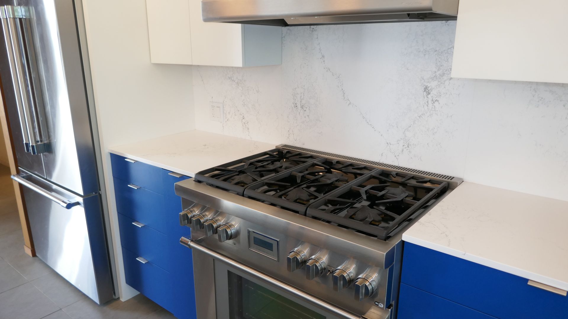 Gourmet kitchen with top-of-the-line Thermador gas range, Bosch refrigerator and dishwasher, custom cabinetry, soft-close wood drawers, and luxurious quartz countertops.